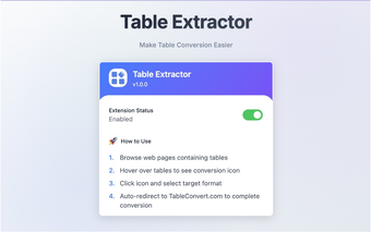 Table Extractor - TableConvert es una extensión de navegador diseñada para facilitar la conversión de tablas de páginas web a múltiples formatos como CSV, JSON, Excel y más. Esta herramienta es ideal para desarrolladores, analistas de datos y cualquier persona que necesite trabajar con datos tabulares, eliminando la necesidad de copiar y pegar manualmente. Con un solo clic, los usuarios pueden extraer datos de tablas en diversas páginas web, gracias a su detección inteligente que identifica automáticamente todas las tablas disponibles.